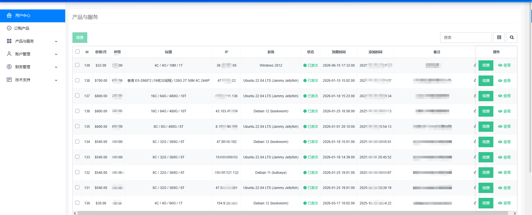 ## 创建一台VPS 1. 首先在产品详情页选择您所需要的VPS套餐类型(CPU内存大小、流量包大小等),接着在VPS配置页,选择您所需要的操作系统、订单时长、地域等信息,点击创建即可。  2. 要访问SiHaiCloud控制面板并创建 VPS,您需要一个SiHaiCloud账户。如果您还没有,可以通过SiHaiCloud新账户注册页面创建一个。 ## 远程连接到VPS 创建VPS后,可远程连接VPS, * 我们推荐您使用SSH方式进行远程连接,操作方式参见[https://learn.microsoft.com/zh-cn/windows/terminal/tutorials/ssh](https://learn.microsoft.com/zh-cn/windows/terminal/tutorials/ssh) * 我们也推荐您使用FinalShell、Termius、putty等工具进行远程连接。 * 您也可以通过控制台右上角的“Console”按钮,点击连接服务器 ## 查看服务器信息 通过Client Area-My Products & Services,点击你想查看信息的服务器名称即可。   ## 更换操作系统 通过Client Area-My Products & Services,点击“Reinstall”,选择您需要的操作系统配置,更换安装即可。   ## 释放VPS 销毁 VPS 将永久且不可逆转地删除 VPS、其内容以及您选择随 VPS 销毁的任何相关资源。通过Client Area-My Products & Services,点击“Cancel”,即可销毁您的资源。  ## 设置或重置服务器密码 通过Client Area-My Products & Services,点击“Reset”,即可重置密码。  ## 查看VPS用量信息 通过Client Area-My Products & Services,左侧导航栏点击“Resource Usage”,即可销毁您的资源。  ## VPS 转移指南 ### 概述 本指南旨在帮助用户如何将自己账户下的VPS转移至其他账户。 ### 准备工作 1. 备份现有数据: 在开始任何转移操作之前,请确保已经完成了当前VPS上所有关键数据的完整备份。 2. 确定接收VPS转移账号的邮箱 ### 转移步骤 1. 点击链接,前往控制台:https://www.sihaicloud.com/index/login.html 2. 点击控制台中您想转移的服务器 3. 拉到页面底端,点击转移(Transfer)  4.在页面弹窗中的输入接收VPS转移的账户邮箱,转移前请确认该邮箱有效,转移费为**5美元**  5.确认完毕后点击第一个开关,并点击确认(Confirm)生成账单  6.账单支付完成后,VPS将立即转移至接收的账户 ### 注意事项 * 请确认接收账户的邮箱有效。 * 转移成功将自动删除所有该VPS的所有历史快照。 * 请勿对一个VPS发起多个转移,由此造成的重复扣款我们将不做退款。 * 如您在转移过程中遇到任何问题,请发工单询问我们的工作人员。